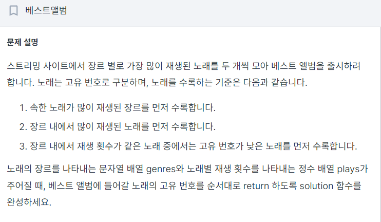 프로그래머스 고득점 알고리즘 kit의 마지막 문제인 베스트 앨범이다.