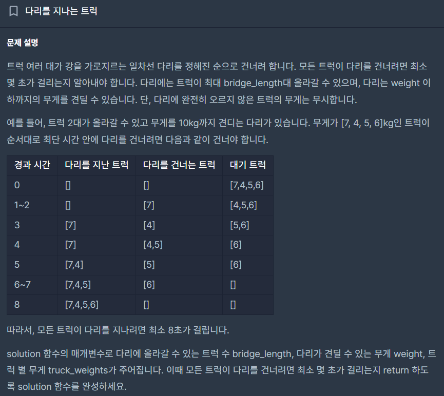 프로그래머스 고득점 kit 스택/큐 문제인 다리를 지나는 트럭 문제다.
