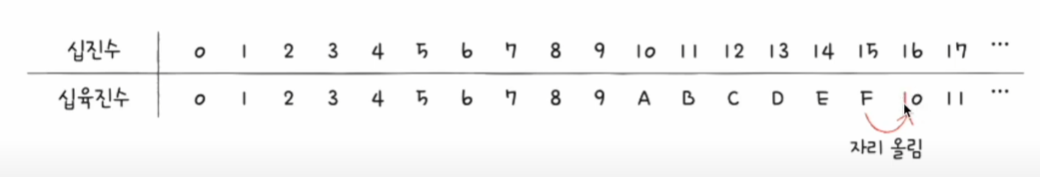 16진수는 15를 넘어가는 시점에 자릿수를 올린다.