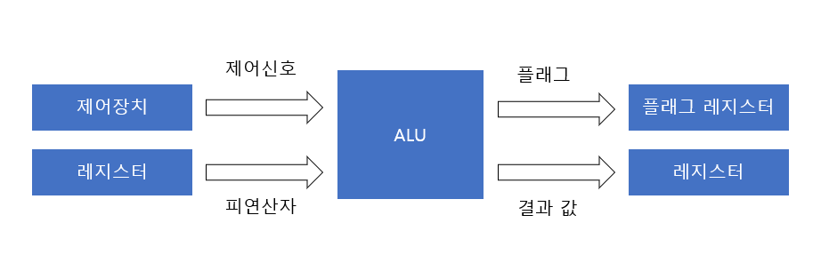 레지스터로부터 피연산자를 받고 제어장치로부터 제어신호(수행연산)를 받는다.
