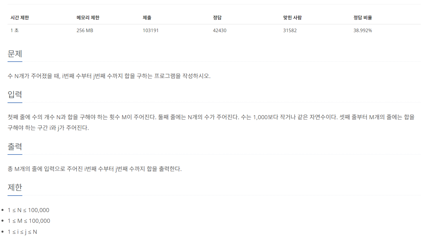 그 뒤, 구간 합 배열인 sum에 구간 합 정보를 저장하고 i와 j 범위의 합을