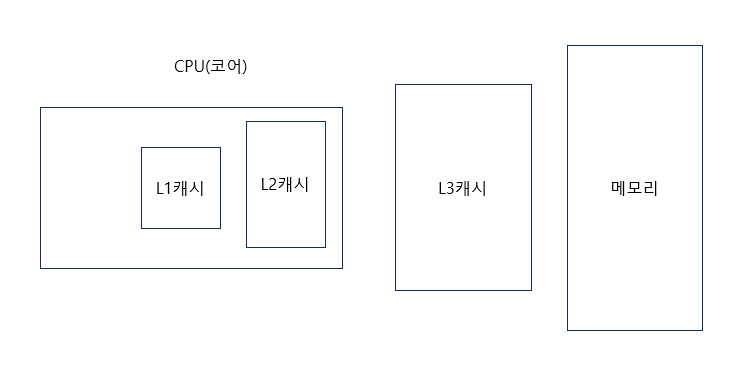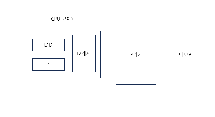 일반적으로 L1, L2 캐시메모리는 코어 내부에, L3 캐시는 코어 외부에 있다.