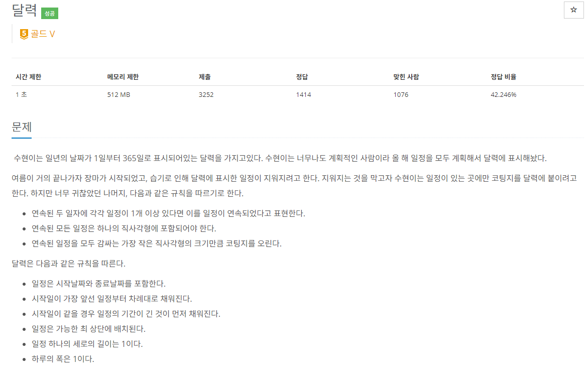 * 유의 사항 : 이어지지 않는 일정에 대해 신경써야 한다. 이것은 직전 일정의 종료일+1과 대소비교로 알 수 있다.
