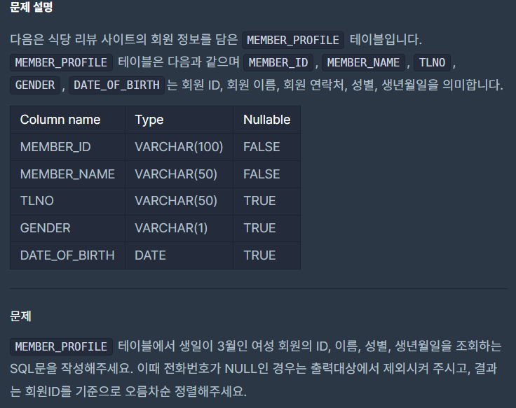 // 조건으로 여자이며 생일이 3월이고 전화번호가 NULL이면 출력에서 제외해야한다.