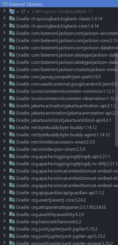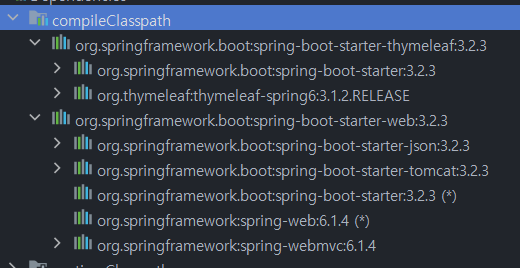 분명 나는 Spring Web과 Thymeleaf만 추가했지만 매우 많은 라이브러리들이 추가된 것을 확인할 수 있다.