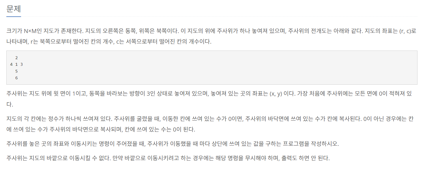 3. map[x][y] 좌표가 0이라면 주사위 면의 숫자를 map[x][y]로, 아니라면 map[x][y]를 주사위 아랫면인 d[6]으로 저장한다.