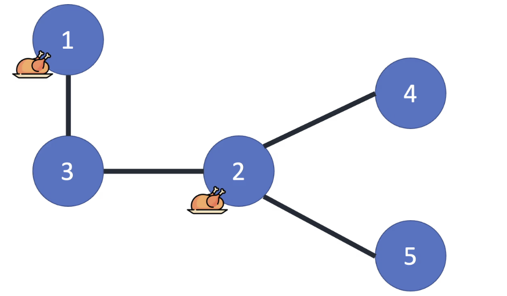 위의 그림과 같이 1번과 2번 건물에 치킨집을 짓게 되면 1번부터 5번 건물에 대해 치킨집까지의 왕복 시간이 0, 0, 2, 2, 2 로 최소가 된다. 2번과 3번 건물에 지어도 동일한 왕복 시간이 나오지만 더