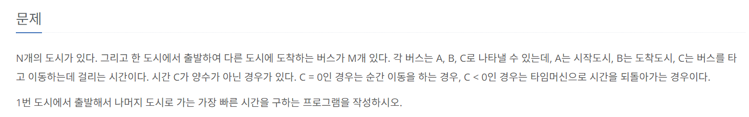 음의 사이클이 존재할 수도 있다는 정보를 얻어 한 정점에서 다른 정점까지 최단 거리를 구하고 음의 사이클 존재 여부를 확인할 수 있는 벨만 포드 알고리즘을 적용해 풀어야겠다고 생각했다.