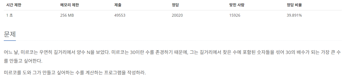 먼저 30의 배수가 되기 위해서는 주어진 양수 N에 반드시 0이 1개 이상 존재해야한다.