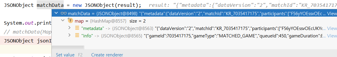map.get("key")를 이용해 접근할 수 있다. 내가 받은 데이터인 matchData 내에는 size = 2짜리 map이 있었으며