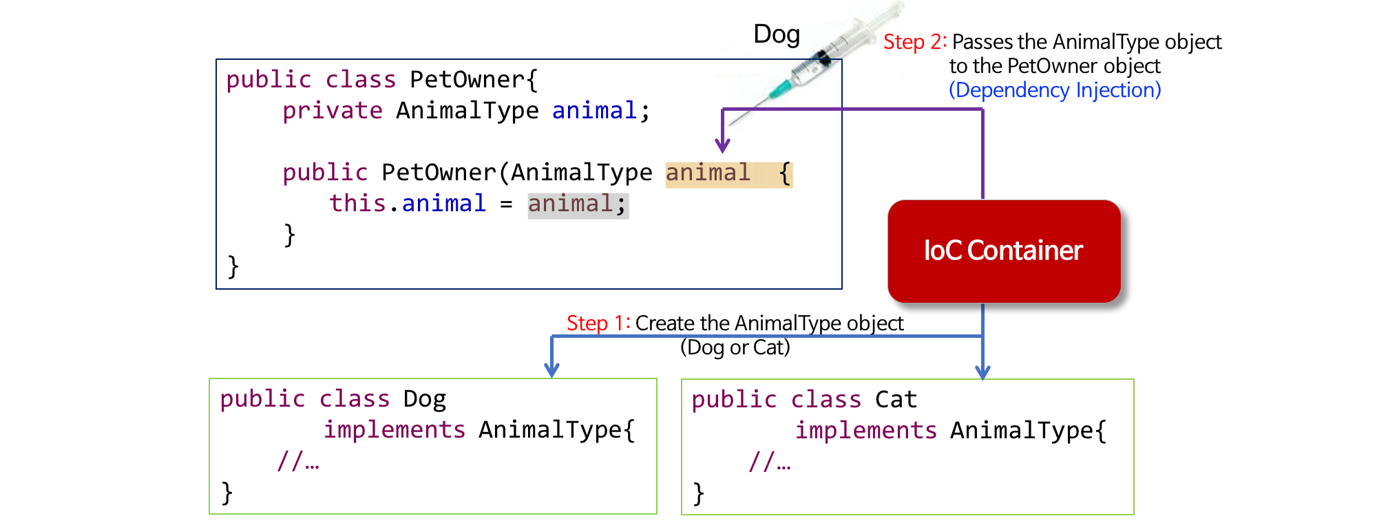 PetOwner에 주입시켜주고 만약 다른 AnimalType을 주입시키고 싶다면 DI - 1 사진에서 처럼